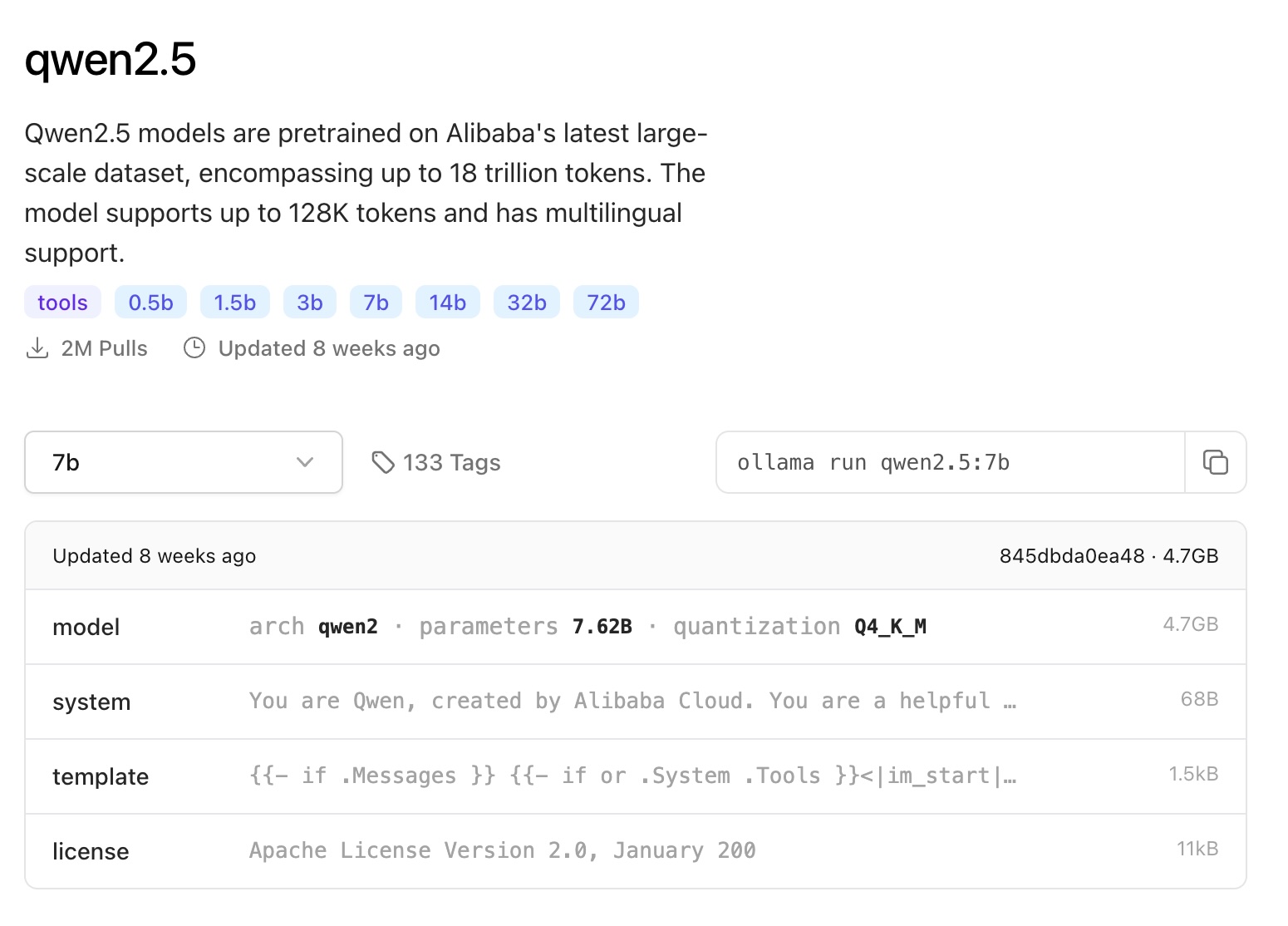 如我们想要qwen2.5的7B模型,可以先在Ollama Models页面通过搜索找到qwen2.5系列模型的页面,从页面中选择7b,进入到qwen2.5模型的7B模型子页面,在页面中部靠右位置,可以看到一键启动该模型的指令ollama run qwen2.5:7b,复制并运行即可。